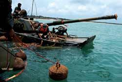 迅速抵达的“铁牛”抢修车在10米开外的地方用抛绳枪把牵引绳射向“蛟龙”4号,由于风浪太大,经过几分钟周折才把牵引绳牢牢挂在“蛟龙”4号坦克上。待两台坦克只有50厘米距离时,抢修人员立即跨上“蛟龙”4号,进入炮塔实施退弹作业。5分钟后,上了膛的炮弹成功退出,大家都松了一口气,但坦克仍处于熄火状态,发动机在海上没办法展开抢修,只能将坦克拖上岸才能修理。正当“铁牛”准备加大马力要往回拖时,一个巨浪拍来,失去方向的“蛟龙”4号顺势直向“铁牛”冲来,只见抢修组人员迅速把几个棕球扔在两车之间,避免了它们“亲密接触”。“铁牛”一声怒吼,拖着“蛟龙”4号奋力驶向岸滩。