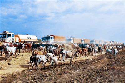 2月5日,第七批赴苏丹维和运输分队执行赴伦拜克运输任务的车队在途中主动为牛群让路。 本报特约通讯员 何悦东摄