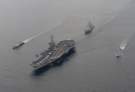 2011年1月26日,美国海军卡尔-文森号航母战斗群与马来西亚海军在马六甲海域组成战舰编队显示武力。