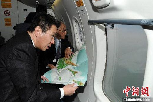 资料图:2010年12月4日,日本外相前原诚司乘坐海上保安厅飞机从空中视察日本同俄罗斯存有归属争议的北方四岛(俄方称南千岛群岛)。