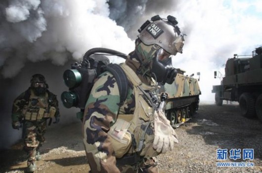 3月3日,在韩国京畿道东豆川市,士兵在训练中。当日,韩美“关键决断”和“鹞鹰”联合军演继续进行,展开防化兵演习。新华社/联合通讯社