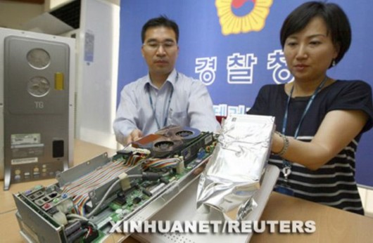 资料图:2009年7月8日,韩国警察厅官员在位于首尔的警察厅总部展示一台被黑客利用来攻击政府机构网站的电脑。