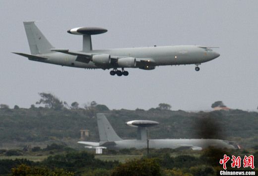 3月20日,在位于塞浦路斯的英国阿克罗蒂里空军基地,一架英国皇家空军飞机准备着陆,另一架预警机停在后方。