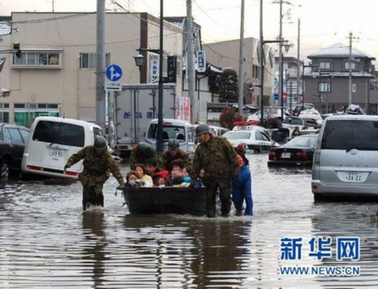 3月12日,在日本宫城县多贺城,士兵帮助受灾民众撤离。 新华社/法新