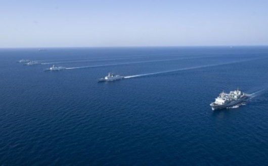 当地时间3月16日,中国海军第七批护航编队与第八批护航编队“温州”号导弹护卫舰、“马鞍山”号导弹护卫舰在亚丁湾东部海域商船集结点附近正式会合。