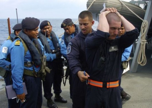 东方网6月27日消息:据《东方早报》报道,6月23日,南中国海,美国海岸警卫队在“钟云”号驱逐舰上与马来西亚海军联合举行打击海盗演练。