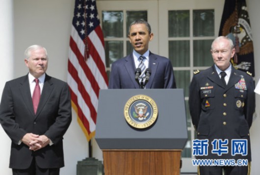 资料图 5月30日,在美国首都华盛顿白宫玫瑰园,美国总统奥巴马(中)宣布提名陆军参谋长马丁·邓普西(右)接替迈克尔·马伦,出任下一届美军参谋长联席会议主席。新华社记者张军摄