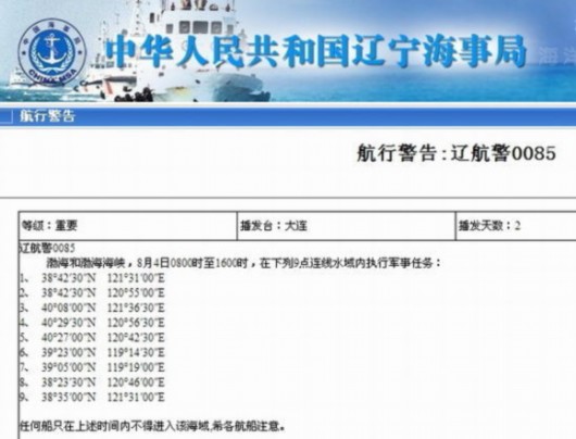 4日,辽宁海事局网站发布一则航行警告《辽航警0085》,其中规定:“在渤海和渤海海峡,8月4日8时至16时,在下列9点连线水域内执行军事任务,任何船只在上述时间内不得进入该海域,希各航船注意……”这条警告一出,引来了众多军迷关注。
