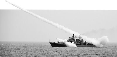 放眼望去,只见空中战机飞旋,海面战舰犁浪。舰艇、潜艇、战机发射的各型导弹穿越看不见的电磁迷雾,或进行点对点的精确打击,或拦截来袭目标,海上炮声隆隆,硝烟弥漫。