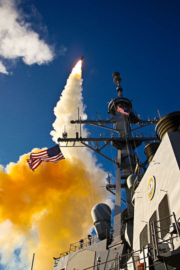 资料图:美国军舰发射标准-3导弹进行拦截试验。