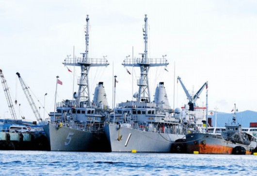 资料图:今年6月27日,参加美菲海上联合军演的美国“护卫者号”打捞舰(左)和“复仇者号”停泊在菲律宾南部巴拉望岛公主港