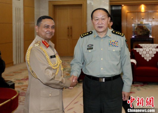 9月15日,中国国务委员兼国防部长梁光烈在北京八一大楼会见了来访的孟加拉国陆军参谋长默罕默德-阿卜杜尔-穆宾一行。中新社发 杜洋 摄