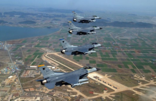 资料图:驻扎在韩国群山空军基地的美军F-16战斗机。