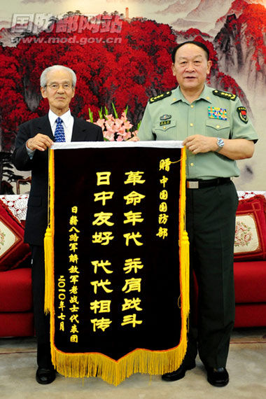 资料图:2010年7月29日,国务委员兼国防部长梁光烈上将在八一大楼接受来访的日本籍老战士代表团赠送的锦旗。李晓伟 摄