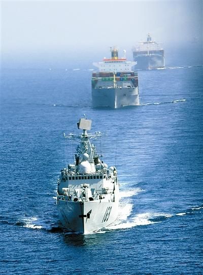资料图:中国海军首批护航编队“武汉”舰在为商船护航。 特约记者李 唐摄