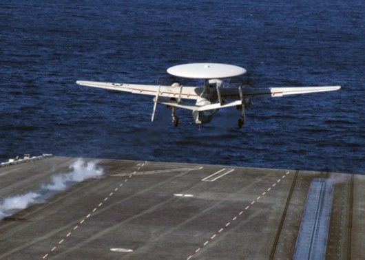 资料图:美国海军E-2C鹰眼预警机从航母上起飞。