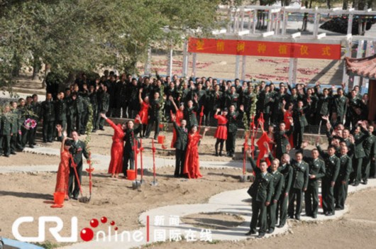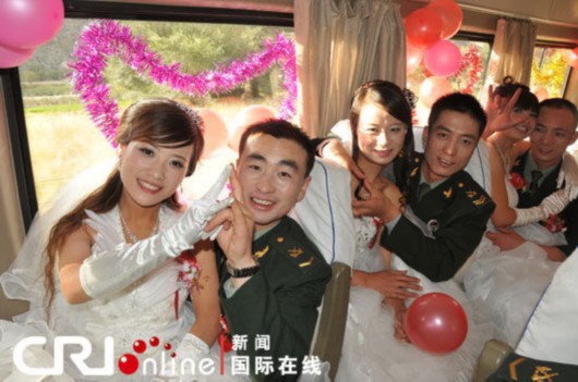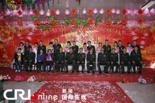 国庆节期间,中国战略导弹部队某旅举办了一场别开生面的集体婚礼,8位士官骨干在官兵的祝福下迎娶了他们的新娘。