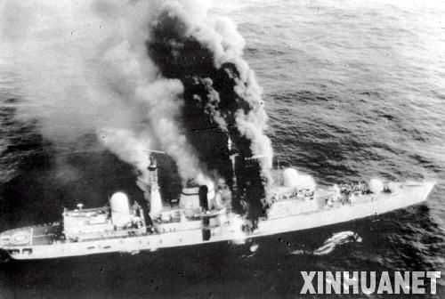 1982年,英国“谢菲尔德”号驱逐舰在马岛冲突中被阿方发射的“飞鱼式”导弹击中起火的资料照。