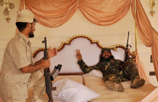 两名武装人员在卡扎菲金黄色的高档卧室中休息