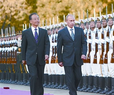 10月13日,国务院总理温家宝在北京人民大会堂东门外广场举行仪式,欢迎俄罗斯总理普京访华。