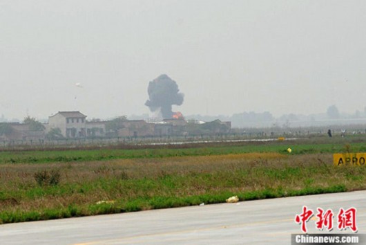 14日上午,2011中国国际通用航空大会在陕西蒲城举行飞行表演时,一架飞豹战机出现意外坠机。图为坠毁后现场腾起硝烟。张远 摄