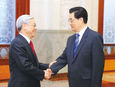 资料图:10月11日,中共中央总书记、国家主席胡锦涛在北京人民大会堂与越南共产党中央总书记阮富仲举行会谈。新华社记者 张铎摄