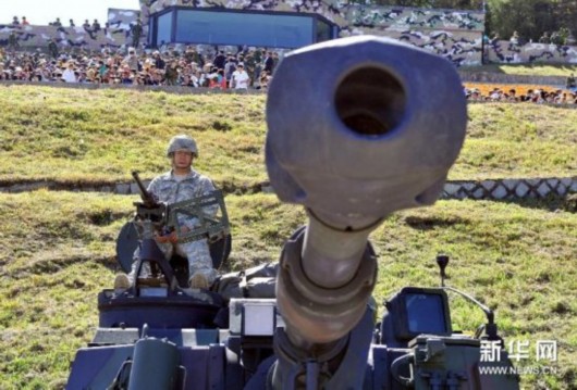 9月30日,在韩国抱川的一个军事训练基地,一名美国士兵坐在榴弹炮上参加韩美联合军演。当日,韩美两国军队在韩国西北部城市抱川举行联合军演,迎接韩国第63个建军节。新华社/法新