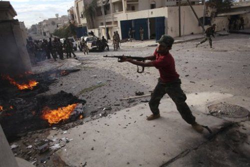 当地时间10月19日,利比亚执政当局士兵与效忠卡扎菲的部队在苏尔特激战。