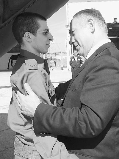 10月18日,在以色列中部的泰勒诺夫空军基地,以色列总理内塔尼亚胡(右)欢迎获释的以色列士兵沙利特。 新华社发