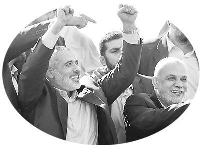 10月18日,在加沙地带拉法口岸与加沙市之间的公路上,哈马斯高级领导人哈尼亚(左一)前往加沙市参加庆祝被以色列关押的巴勒斯坦囚犯重获自由的集会。