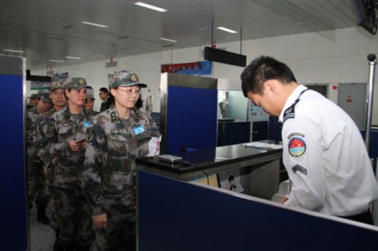 中国人们解放军医疗救援队队员正在通过安检。李翔摄