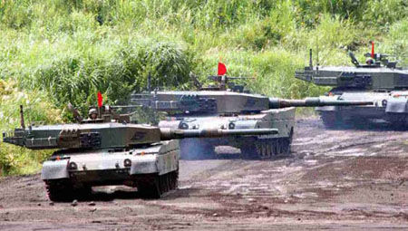 资料图:陆上自卫队90式主战坦克编队进攻。