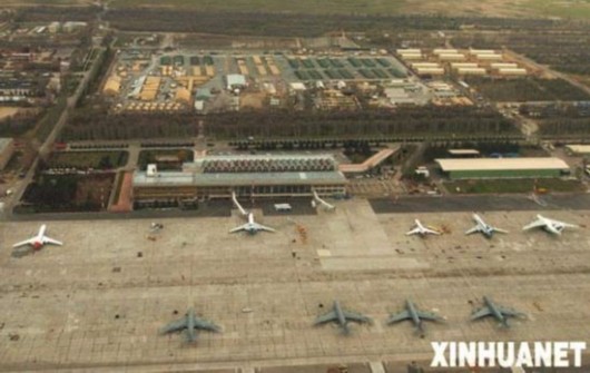 资料图:美国军用飞机(下)停在吉尔吉斯斯坦首都比什凯克附近的马纳斯国际机场的资料照片,画面上方为美军基地的建筑。(2005年4月8日摄)。图片来源:新华网