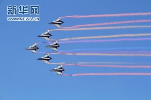 这是八一飞行表演队六机编队在进行表演(9月1日摄)。新华社发(申进科 摄)