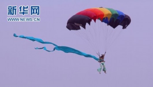 跳伞队7名女队员身着美丽的霞衣,头戴璀璨的发冠,身披彩绸从天而降,不停地把祝福的鲜花撒向大地,营造出仙女下凡的梦幻意境。