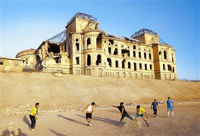 阿富汗青年在喀布尔著名的达鲁拉曼宫废墟旁踢足球。 本报资料图片