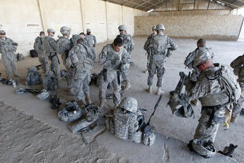 资料图:美军在伊拉克一座基地内的士兵在巡逻前整理行装,驻伊美军将在今年底前全部撤出伊拉克。