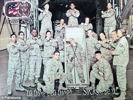 据香港《文汇报》16日报道,美国空军日前闯出祸端,15名男女士兵身穿迷彩服,围着一副棺材交叉双臂摆出“X”手势,而棺材中是他们活生生的战友,他全身扣上锁链装死,颈上还带着绳圈。照片被曝光后,马上惹怒了不少士兵及家属。