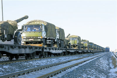 “呜——”12月18日11时许,一列满载重型装备、军需物资和参加演练官兵的军用专列驶入北京军区某训练基地。长长的汽笛声打破了塞北雪原的宁静,标志着这个大型训练基地正式接入国家铁路网,参演部队军用专列从此可以直通演兵场。