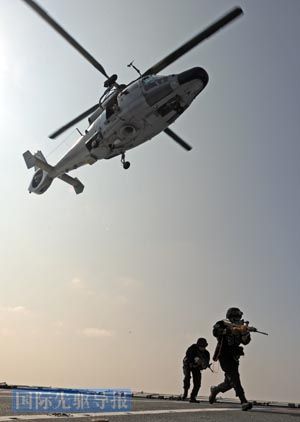 原文配图:中国海军直升机与特战队员进行演练。