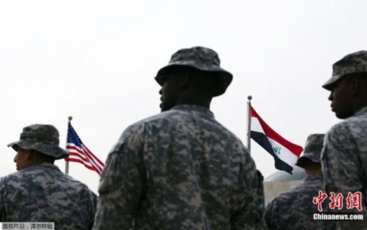 12月15日,美国驻伊拉克部队在巴格达附近的军事基地举行了降旗仪式。这标志着历时九年的美国伊拉克战争正式画上句号。按计划,驻伊美军将在年底前全部撤出伊拉克。图为降旗仪式现场。