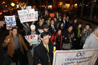 丹尼·陈的同学及支持者举行纪念游行活动,高举标语要求查明真相(中新网)
