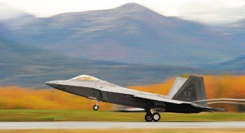资料图:一架F-22战机在美国阿拉斯加州安克拉治的空军基地起飞。