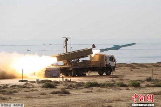 资料图:1月2日,伊朗海军在伊朗南部霍尔木兹海峡附近试射一枚导弹。