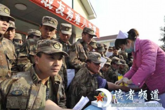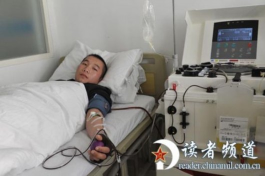 1月29日,某工兵团修理连上等兵熊伟经南京军区总院诊断为身患突发血栓性血小板减少性紫癜病,生命垂危,急需置换血浆救命,而医院库存血浆告急。1月31日下午14时30分,近千名官兵蜂拥至临时采血点,积极为战友熊伟捐献救命的血液。