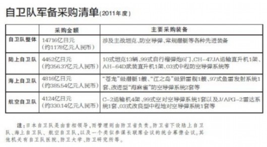 据日本媒体13日消息,日本右翼分子、东京都知事石原慎太郎在记者会上称,日本自卫队应该“常驻”钓鱼岛。日本政府日前决定修改相关法律,全面推进引入“集团自卫权”。而在日本防卫省网站上,公布的所谓自卫队2011年度装备采购清单显示,日本自卫队在2011年的军备采购费用总额为14716亿日元(约合1178亿元人民币),采购的装备涉及主战坦克、自行榴弹炮等各种先进装备。尽管有评论认为日本高额采购费显示日本武器的高昂价格,但透过这份名单,我们却需要警惕一个蠢蠢欲动的日本军国主义的松绑图谋。