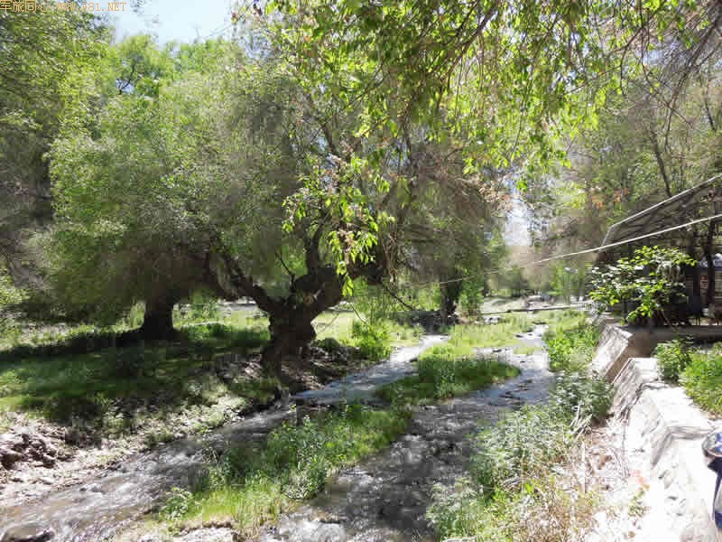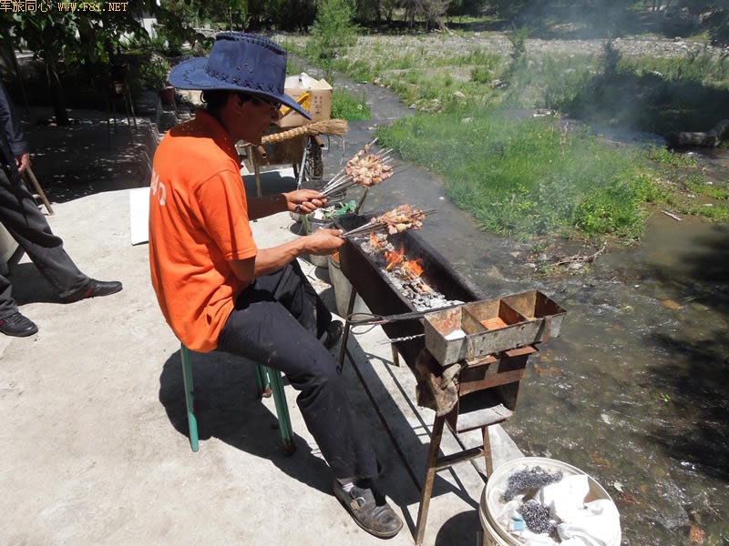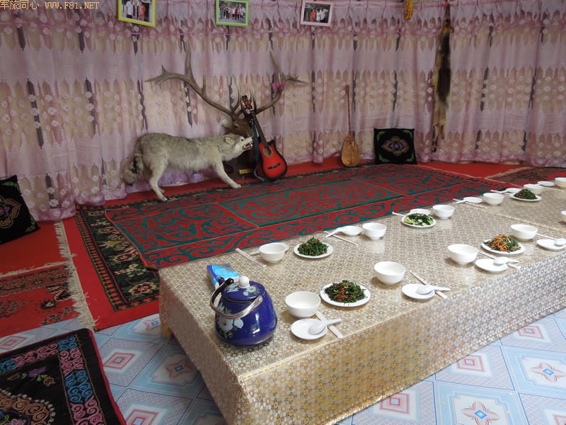 从天池下山,两点半左右到达一个叫骏马村的地方午餐。也是在毡房里。村边流淌的小溪应该是从天池下来的,溪边是高大的树木,真正的原生态。站在岸边看对岸,树荫下有一群鸡在自由自在的觅食,绝美的田园风光。主人已经为我们准备烤羊肉,我到毡房里看看,有牛、羊的标本,还有新疆乐器等陈设,女主人告诉我旁边的毡房还有狼,于是我跑到旁边的毡房去拍了一张照片。