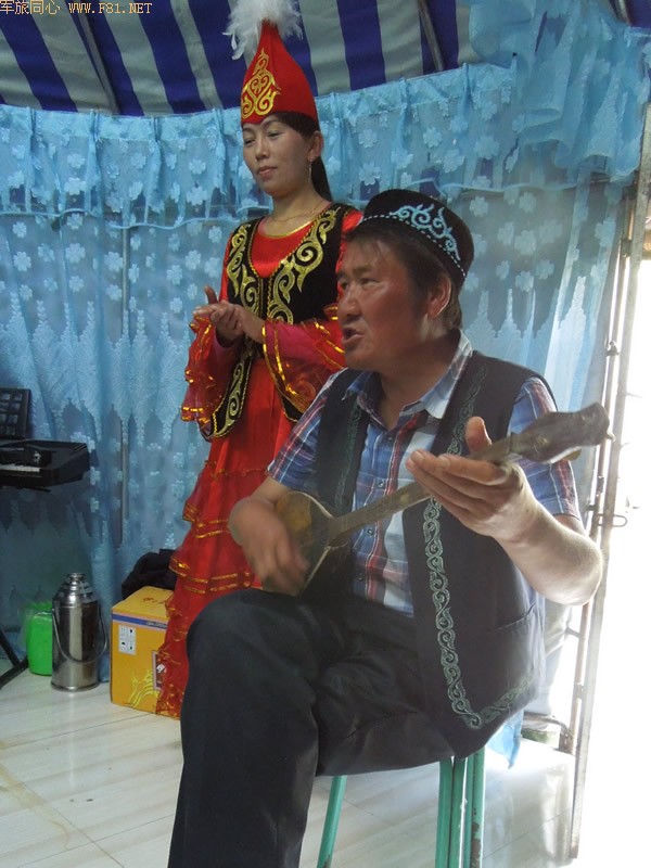 主人招呼我们入座,这时提议能有新疆歌曲就更好了。不一会,主人请来两位哈萨克族青年,男士负责唱歌,女士负责劝酒。细问才知道这位男士才38岁,我开始以为是老者。据说他自己可以创作歌曲,而且上过电视台。自弹自唱,歌声极其悦耳,连着唱了好几首,最后演唱他自己创作的歌唱党和祖国的歌,我们都禁不住随着接怕鼓掌,场面融洽和谐达到了高潮。我已经记不清喝了多少酒,酒不醉人人自醉。