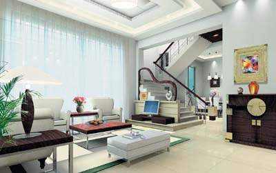 这个客厅设计方案中最令设计者引以为傲的是墙边的琉金木柜。因为这个客厅的装修风格以米色为主色,而以黑色为主金色为辅的琉金木柜打破米色的单一之余,更为客厅增添华丽的色彩。柜上的金色壁画也与其相互呼应。而天花、沙发、地砖等都多用直线,给人干净利落的感觉。值得注意的是,客厅的另一出彩之处在楼梯扶手的设计。波浪形的木制扶手与直线形成强烈对比,带来一种跳跃感。