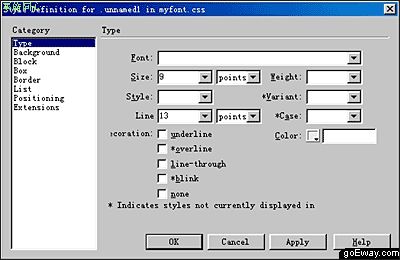 如上图,在 Name 处为你的样式起一个名字,Dreamweaver 默认会在名字前一个小数点,目的是避免与其他HTML标记混淆,例如我在这里起的名字是“myfont”(将unamed1改为myfont);Define 是选择使用外部样式表还是只在本页建立样式(This Document Only),我们选择前者,这样就可以多页共用一个样式表,确定按 OK。